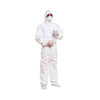 限次型無紡布透氣型連體服,彈性兜帽、袖口、腳踝口,防粉塵顆粒。100% SMS三層無紡布材質。 本產品可對輕度化學液體噴濺以及有毒干燥粉塵提供保護。適用于一般石棉控制場....