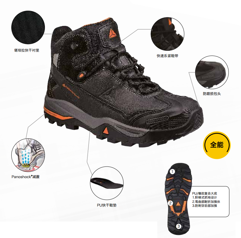 TREKWORK系列S3全牛皮高幫安全鞋,頭層進口牛皮鞋面,柔軟舒適,聚酰胺吸濕襯里,可脫卸預成型聚酯纖維EVA鞋墊,粘合PU中底帶Panoshock?減震材料,橡膠大底,非金屬合成材料保護包頭和防刺穿中底,防砸、防刺穿、防靜電、后跟減震、耐磨、耐油、耐酸堿、SRC級防滑、耐250℃高溫、耐寒。 TW300為低幫款。