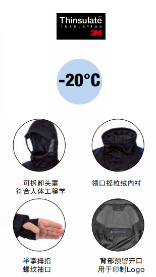 PU點(diǎn)塑透氣型戶(hù)外防寒服,獨(dú)特的熒光條設(shè)計(jì),防水接縫,可脫卸兜帽隱藏式拉鏈,防風(fēng)前片襟及拇指防風(fēng)袖口,3M新雪麗保暖填充物,可抵御-20°C嚴(yán)寒。防中雨,透氣排汗、干爽舒適。 顏色:NO-黑色