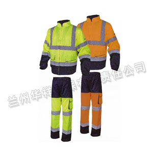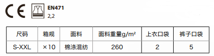 兩件套熒光夾克,54%棉46%滌,260g/m2,松緊袖口, 反光等級2級,黑黃高亮警戒色,條紋狀設計提高視覺沖擊,有效起到熒光警示作用,適合室內外多種天氣穿著。 顏色:JM-黃色+藏青色 OM-橙色+藏青色
