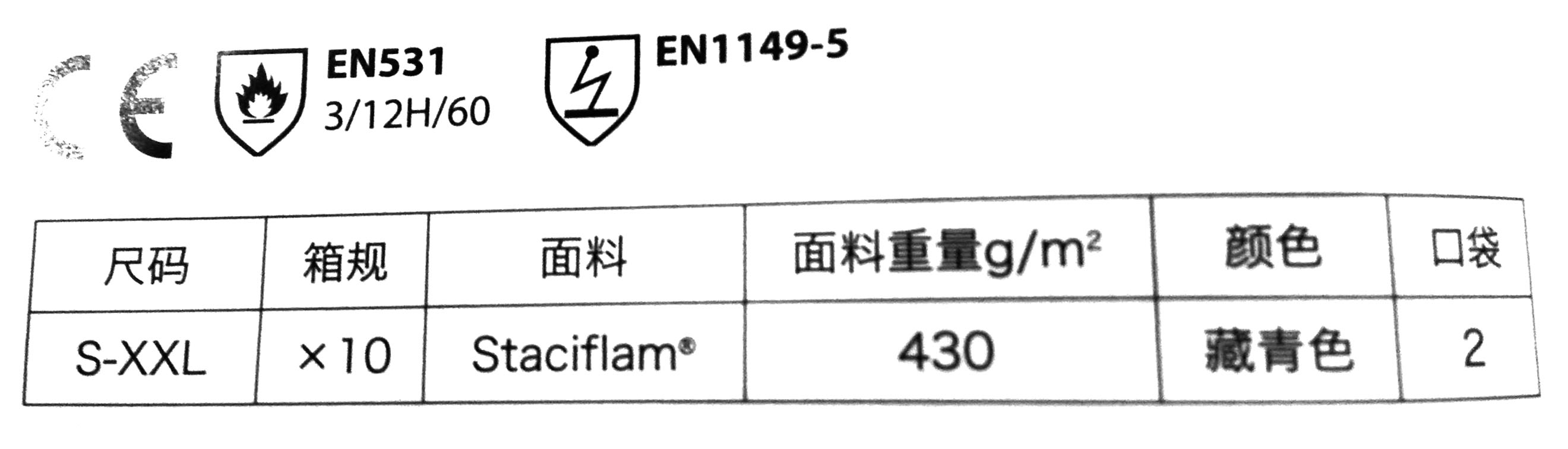 阻燃防靜電搖粒絨夾克,60% Staciflam FR 聚丙烯腈纖維和38%棉以及2%防靜電碳纖維混合織造,430克重,隱藏式紐扣領(lǐng),配兩個(gè)工具口袋,簡(jiǎn)潔實(shí)用。主要用于高可燃性等高危險(xiǎn)環(huán)境,防止靜電釋放引發(fā)事故,也用于電子行業(yè)。