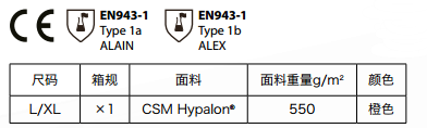 聚酯纖維+雙面CSM Hypalon涂層、組件和接縫采用內/外部雙硫化密封。高氣密性防水拉鏈。較高強度、抗沖擊、高清晰度面屏。胸前和腿部配置4毫巴排氣閥門,抗多種高濃度化學試劑滲透長達8小時以上。卓越的防酸堿性能,防火阻燃,耐UV/臭氧、抗曲繞龜裂、耐磨、防霧、防固體顆粒。配一體式防化手套、防化靴。